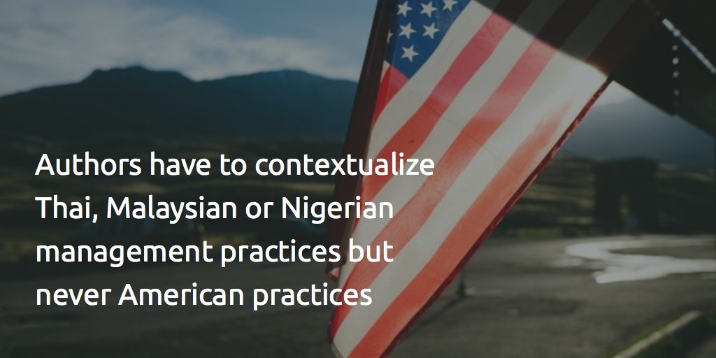 But I have been scratching around in the management literature to find anything that passes this superficial level of analysis of ‘American culture’, that provides a multidimensional analysis, and an understanding of the heterogeneity of American cultures. I have turned to the wider social science literature, but can find little of this being applied in cross-cultural management studies. American management culture is assumed as the the standard and therefore invisible among the cross-cultural studies I receive as a journal editor. The onus on authors is always to explain and contextualise Thai, Malaysian or Nigeria management practices (often citing Hofstede or GLOBE) but never American practices. Like Thai, Malaysian and Nigerian societal culture, American culture is riven by class, gender, race and geography. Yet within the American context, within management studies most of this is invisible. In any serious cross-cultural study these aspects need to be fully discussed, and brought within full range of scholarly perceptions.